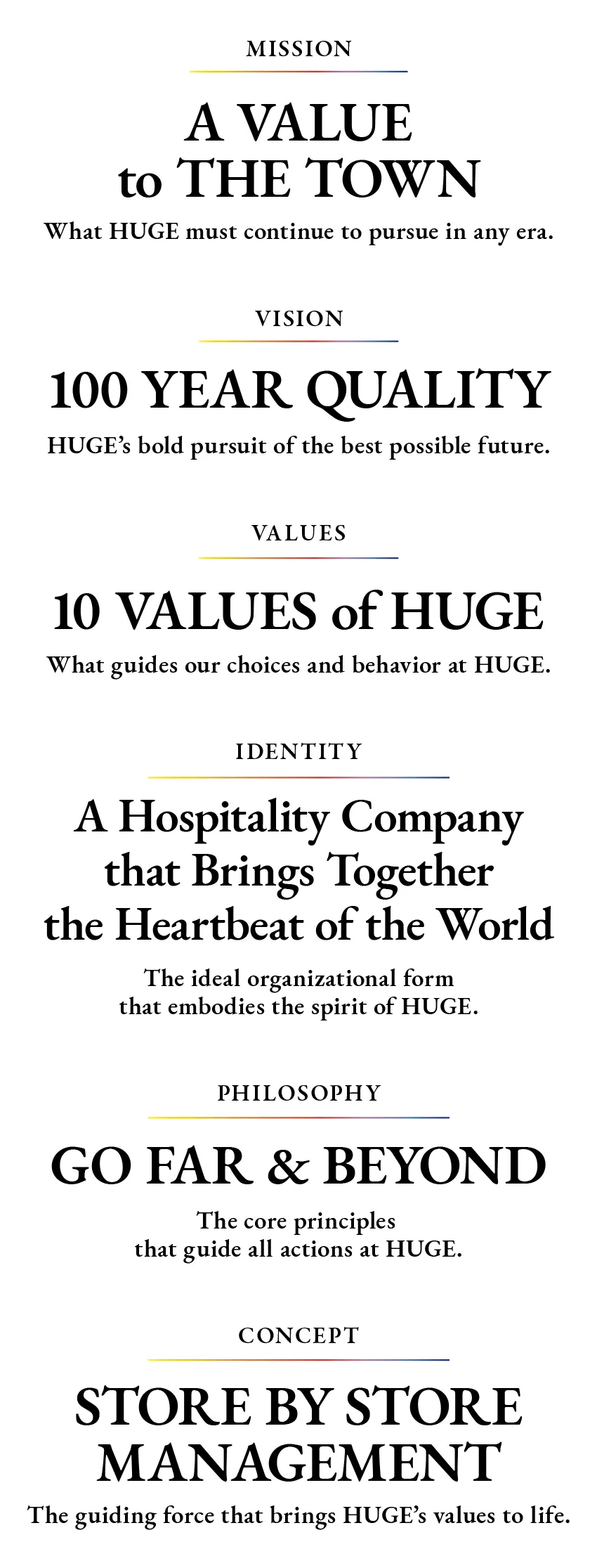 A comprehensive page of the restaurants, retail shops, and products developed by HUGE Co., Ltd.