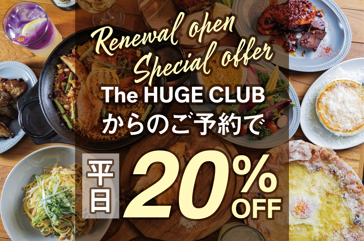 Make a reservation and visit us on weekdays through our official booking site, The HUGE CLUB, and enjoy 20% off your total food and beverage bill. Don’t miss this chance to try our renewed rotisserie dishes and cocktails.