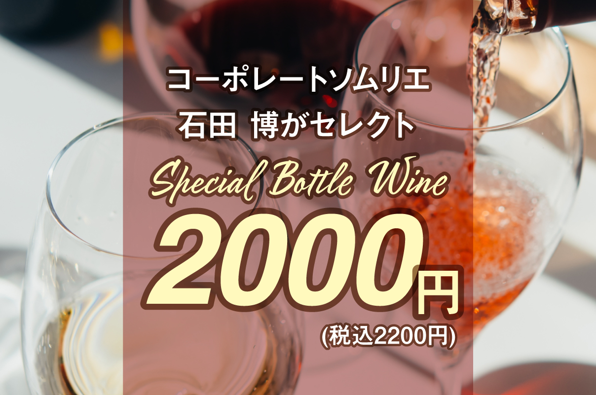 Enjoy a bottle of wine selected by our Corporate Sommelier, Hiroshi Ishida, for ¥2,000 (¥2,200 including tax) per bottle.