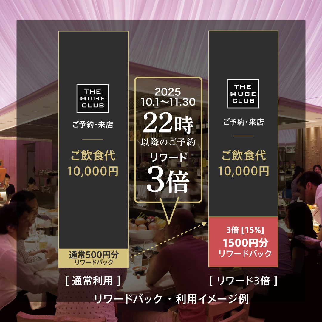 RIGOLETTO KITCHENの深夜営業が再開を記念して、10月1日〜11月末までの期間限定で、公式予約サイト「The HUGE CLUB」から22:00以降の時間帯をご予約いただいたお客様には、通常の3倍のリワードを付与いたします。 夜の銀座コリドー街をさらに楽しめる特別なこの機会に、ぜひRIGOLETTO KITCHENでお過ごしください。