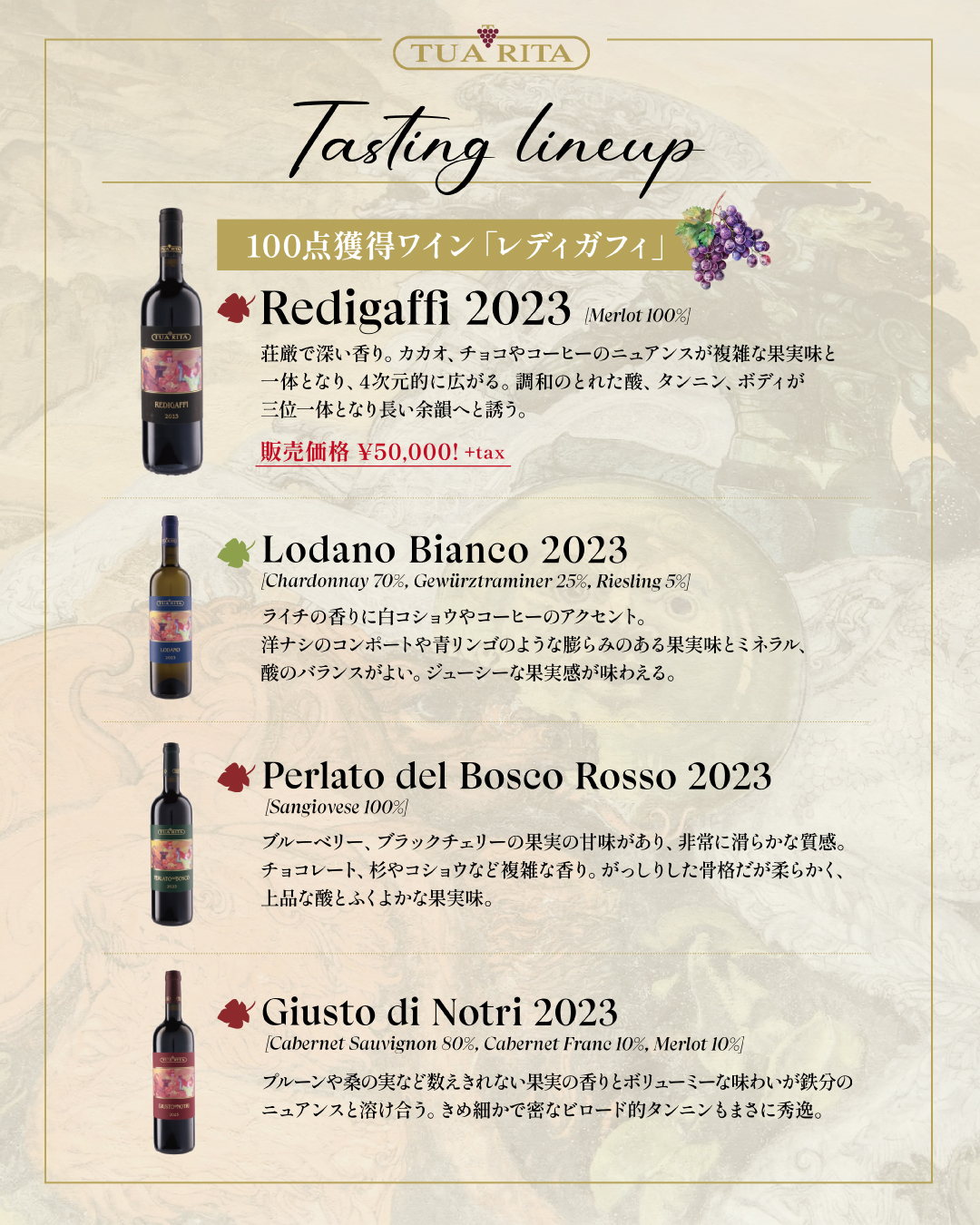 1984年、無名だったトスカーナ州スヴェレートの地で始まった、トゥア・リータの物語。家族経営の小さなワイナリーから生まれたワインは、やがて世界中のワインラヴァーを魅了し、フラッグシップ「レディガフィ」は 二大評価誌で100点を獲得するという快挙を成し遂げました。当日はトゥア・リータ3代目ジョヴァンニ・フラスコッラ氏を 迎え、ワイナリーの歩みやワイン造りへの想いに触れながら、100点獲得ワイン「レディガフィ」を含む 特別なテイスティングをお楽しみいただけます。この機会にぜひ味わってみてください。
