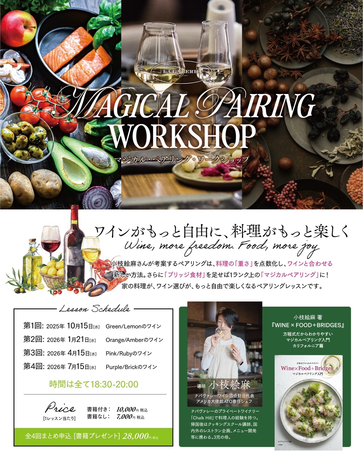 このレッスンでは、小枝絵麻さんが考案する3Stepの「ペアリング方程式」を基に、ワインの特徴の捉え方、家庭でもっとワインを楽しめる食材の選び方や調理のコツを学びます。
