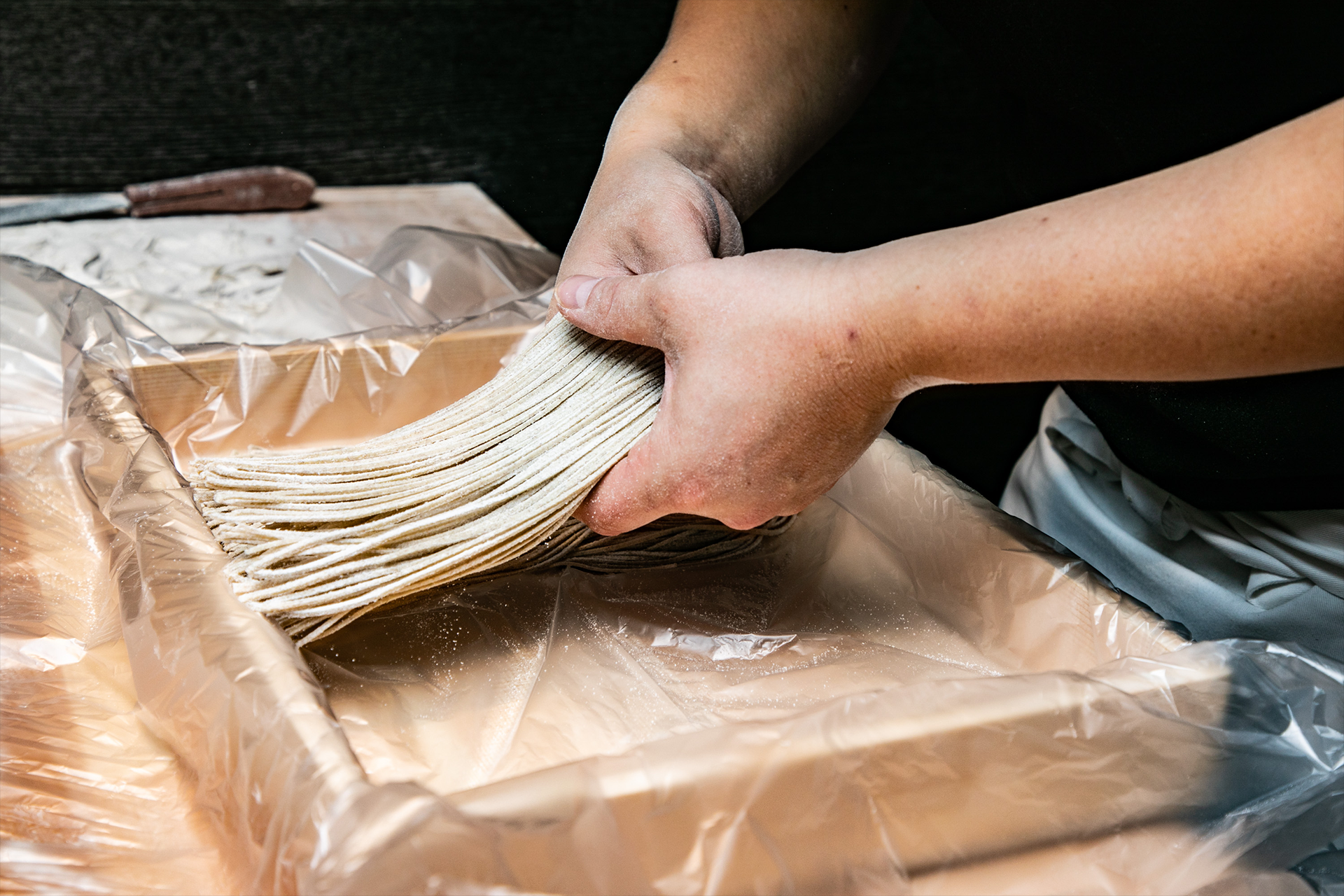 その時期に最良の蕎麦粉を使い、店内で打つ、香り高い手打ち蕎麦を楽しめます。